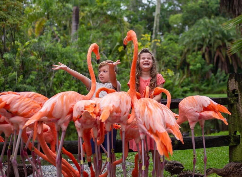 Two overjoyed children feed flamingos at Sarasota Jungle Gardens. Photo via @sarasotajunglegardens